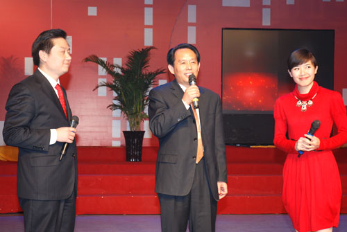 聯(lián)歡會主持人王鐵軍、閆虹共同邀請韓總經理上臺表演節(jié)目