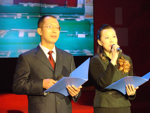 聯(lián)歡會主持人王鐵軍、閆虹共同邀請韓總經理上臺表演節(jié)目